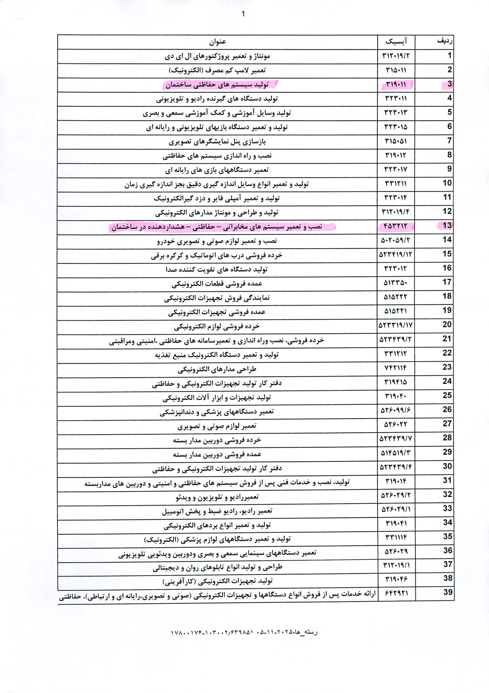 اضافه شدن رسته تولید نصب و تعمیر سیستم های حفاظتی ساختمان